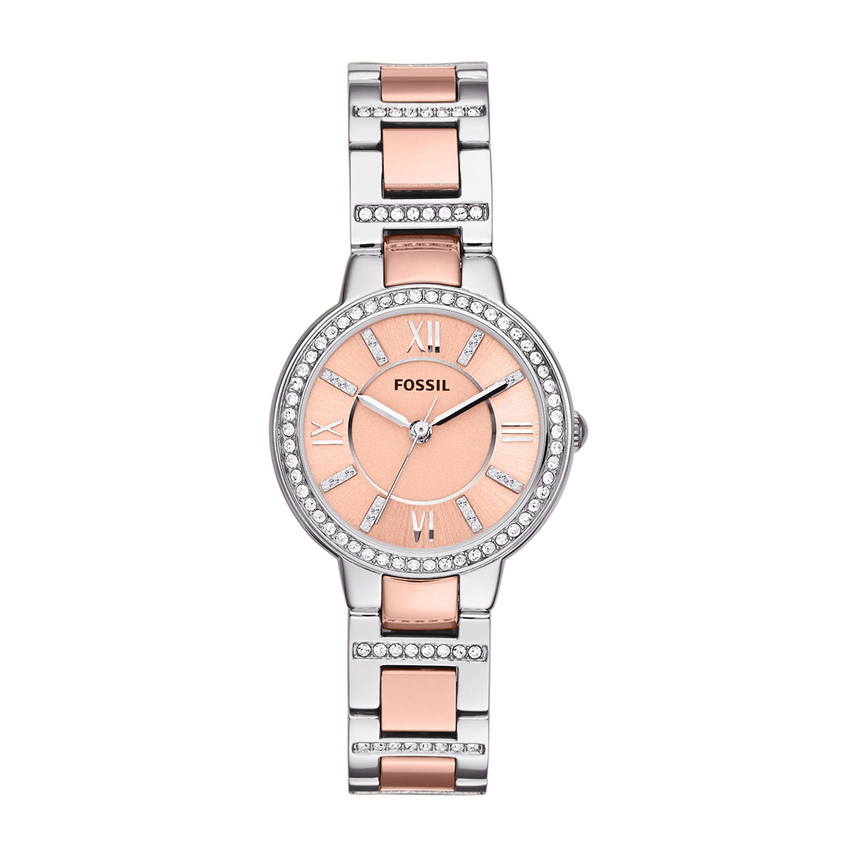 Mẫu đồng hồ ES3405 từ thương hiệu Fossil với thiết kế tôn lên vẻ thời trang của phái đẹp với thiết kế tinh xảo vỏ viền ngoài đính kèm các viên kim cương xung quanh, kết hợp cùng nền mặt số vàng hồng tông màu trẻ trung đầy sang trọng.