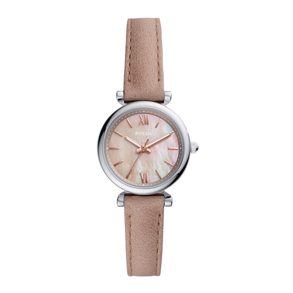 Mẫu Fossil ES4530 thiết kế đơn giản 3 kim trên nền mặt trắng xà cừ size 28mm đi cùng các chi tiết vạch số tạo nét thanh mảnh nữ tính tone màu vàng hồng thời trang.