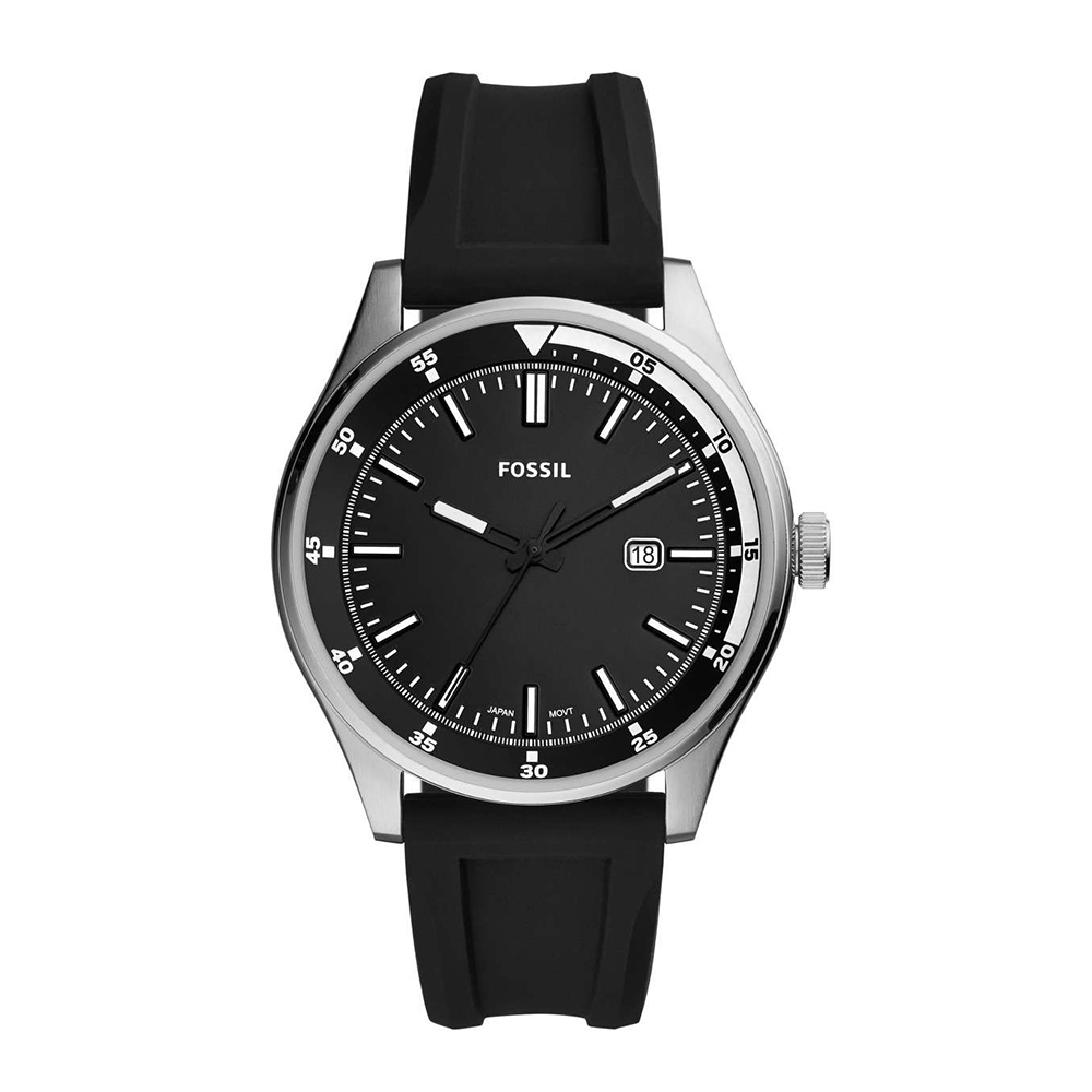 Mẫu Fossil FS5535 phiên bản đầy cá tính với mẫu dây đeo cao su tone đen, mặt số đen kích thước mặt 44mm đi kèm thiết kế viền số bezel tạo hình dày dặn đầy nam tính.